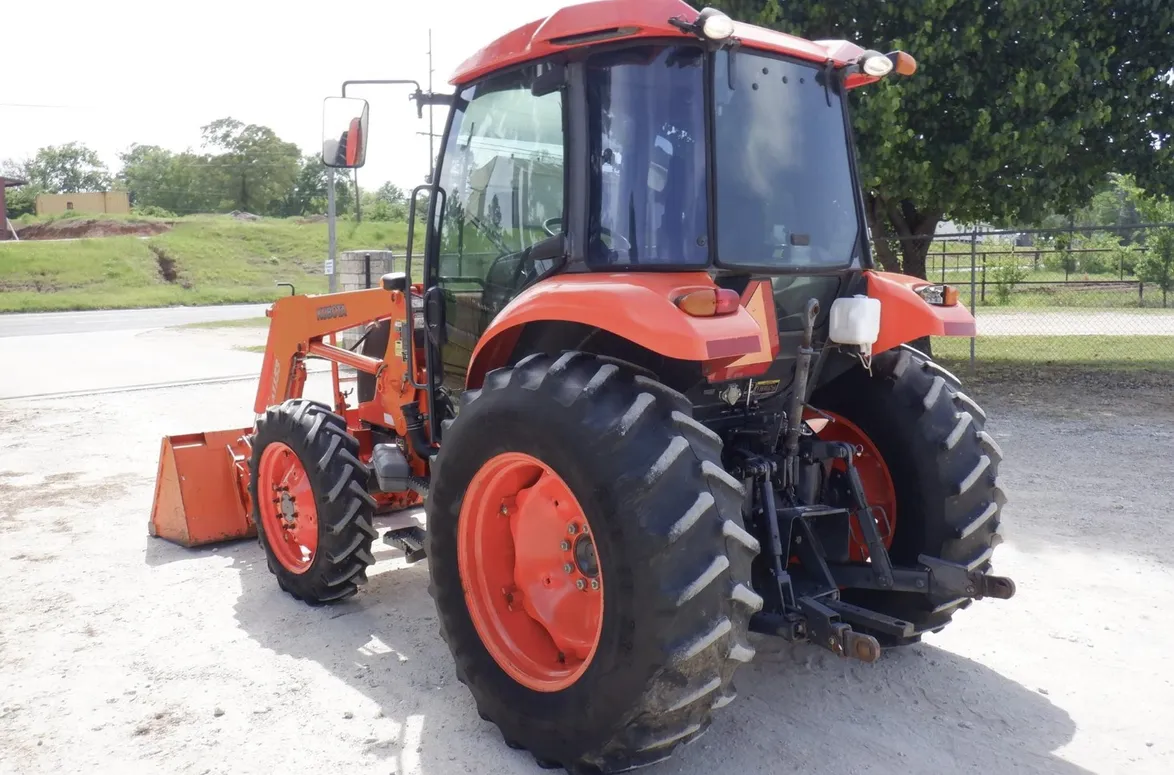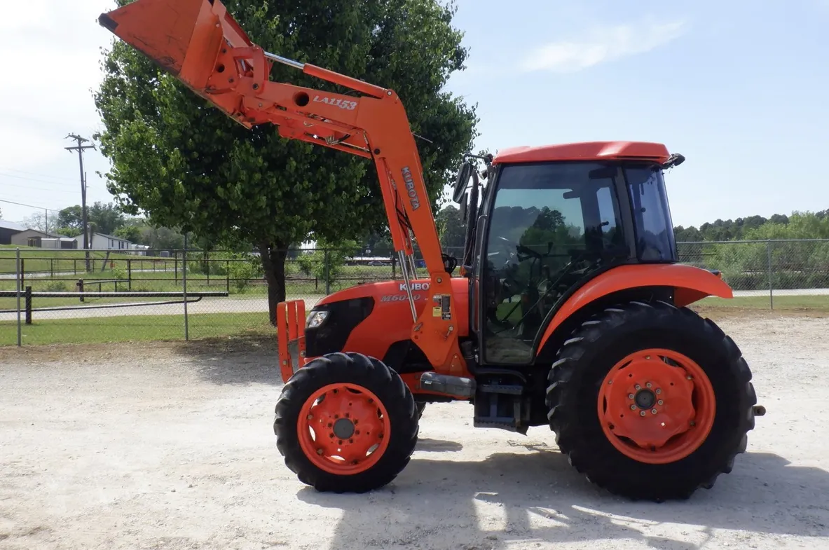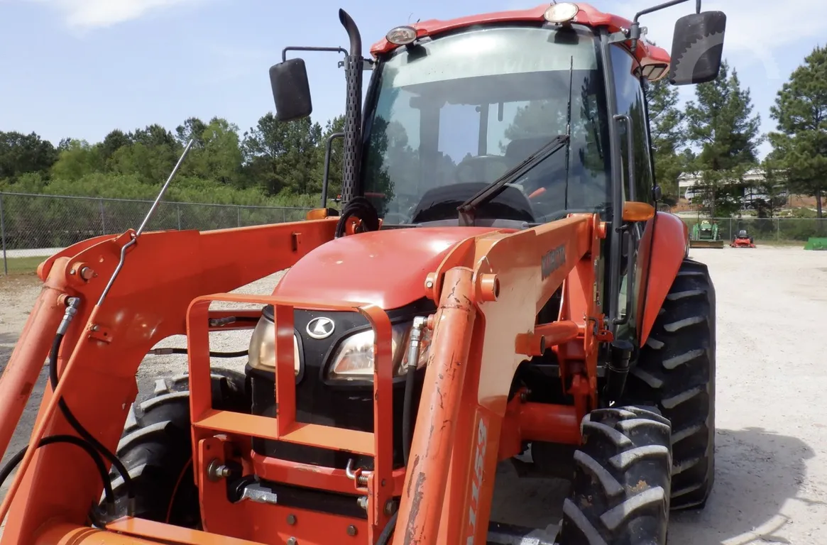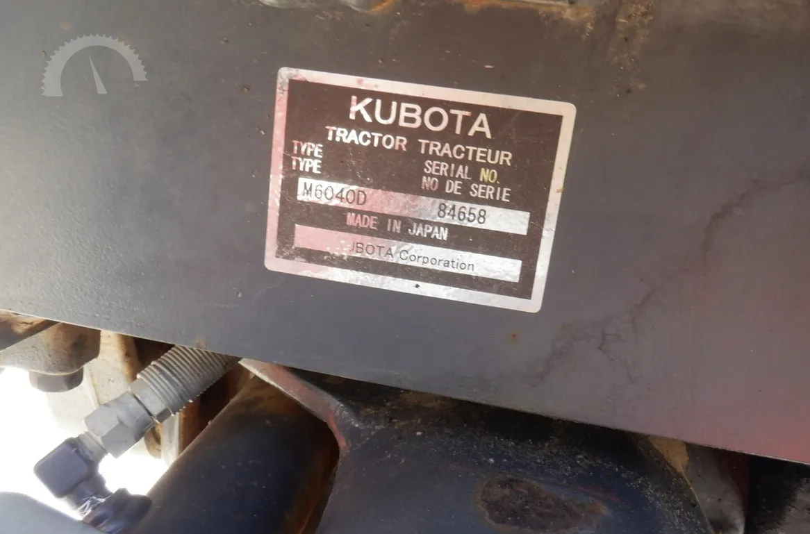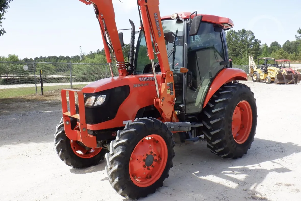 Year: 2013, Make: Kubota, Model: M6040, Hours: 1,574, Drive Type: 4×4, Transmission: Hydraulic Shuttle Shift, Fuel Type: Diesel, Engine: 64 HP, Cab: Enclosed with Heat, AC & Radio, Loader: Kubota Front-End with Quick-Attach Bucket, PTO: Rear 540, Hydraulic Remotes: 1 Rear, Differential Lock: Yes, Three-Point Hitch: Yes, Serial Number: 84658.