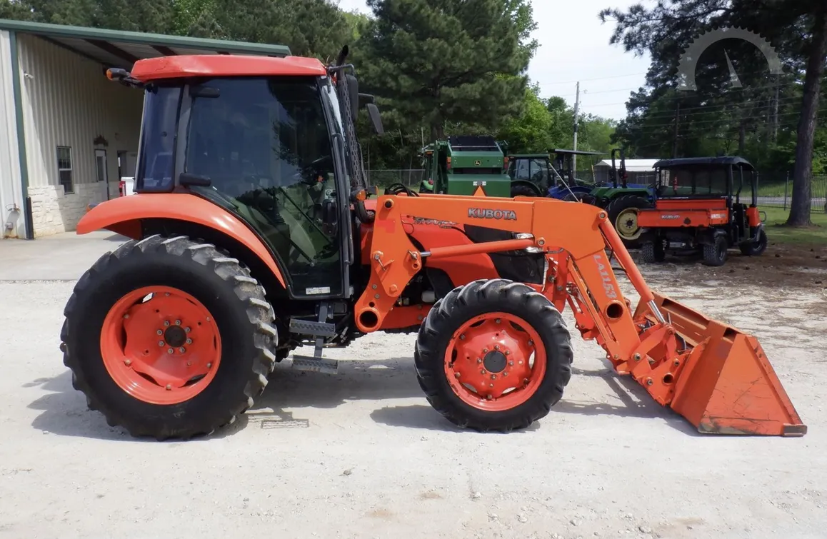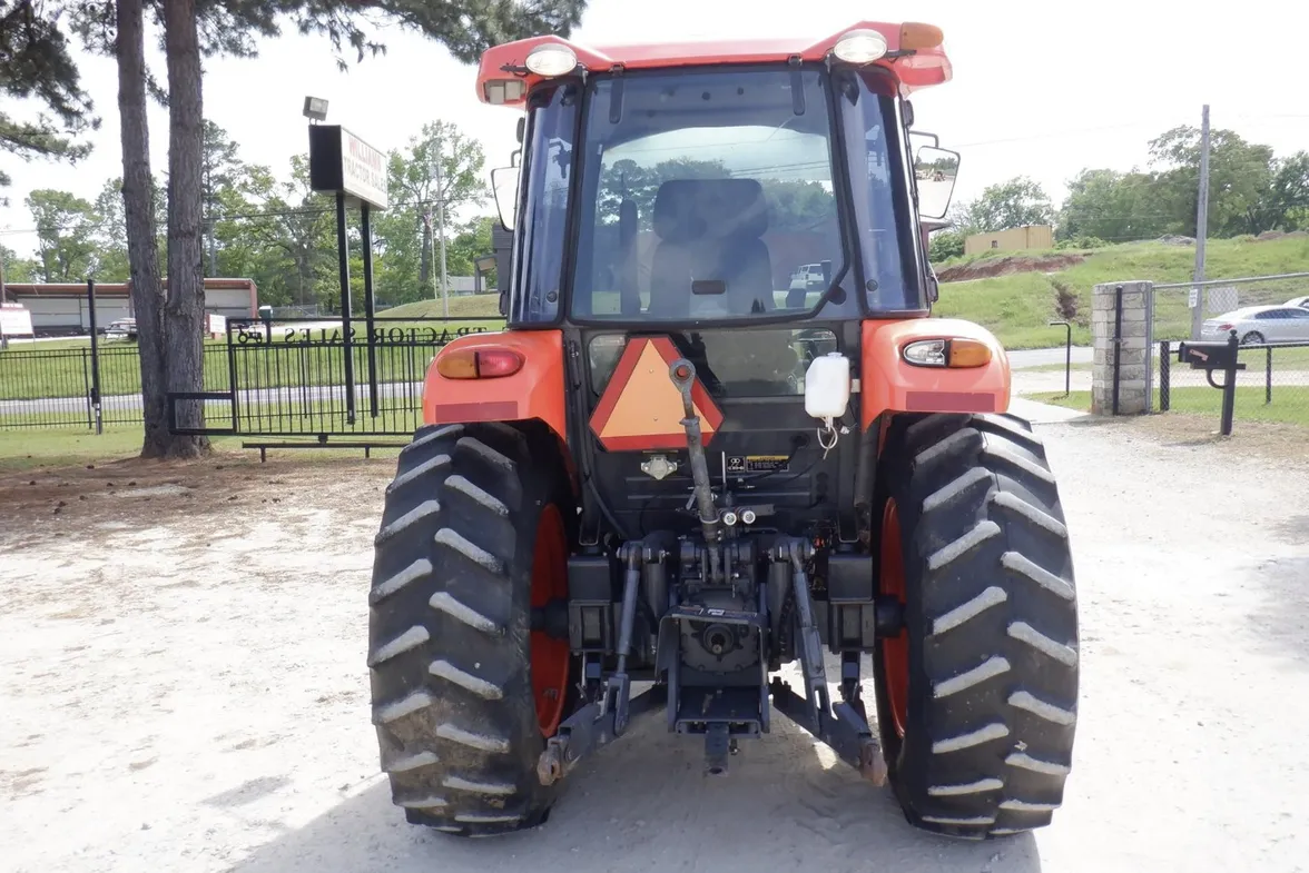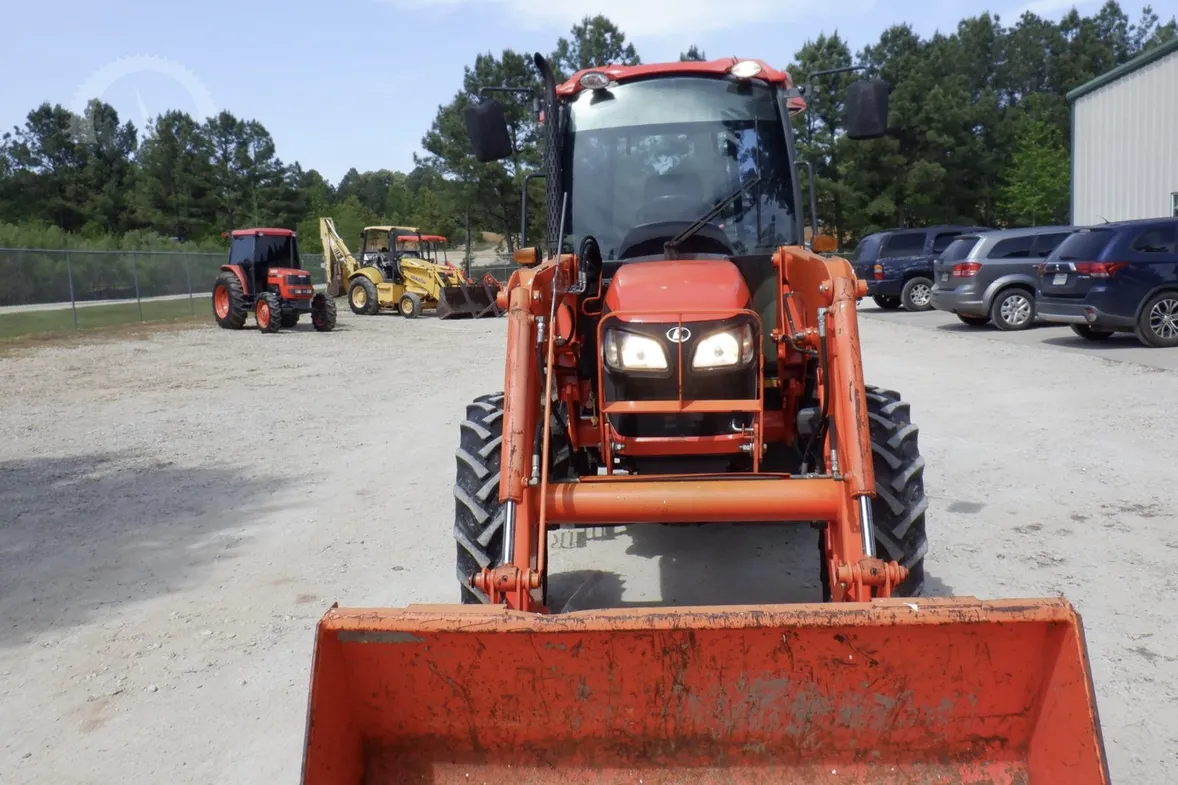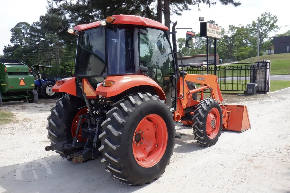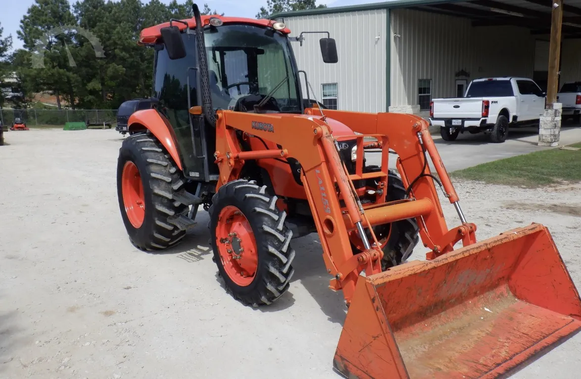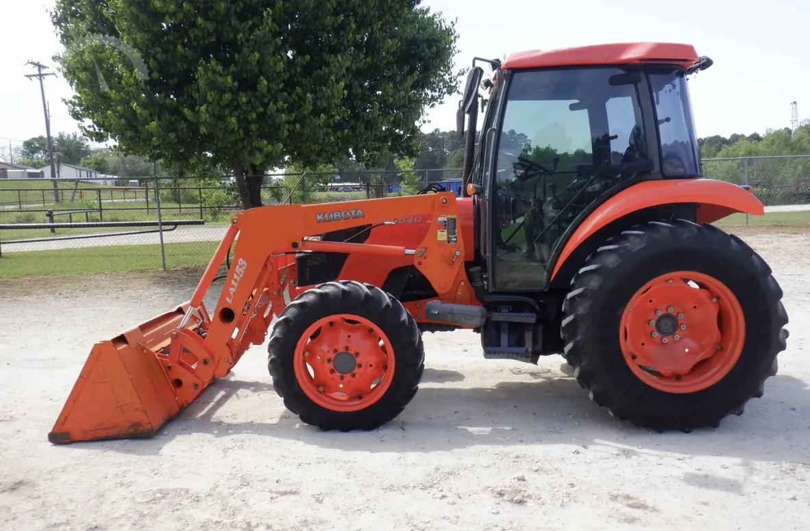 Year: 2013, Make: Kubota, Model: M6040, Hours: 1,574, Drive Type: 4×4, Transmission: Hydraulic Shuttle Shift, Fuel Type: Diesel, Engine: 64 HP, Cab: Enclosed with Heat, AC & Radio, Loader: Kubota Front-End with Quick-Attach Bucket, PTO: Rear 540, Hydraulic Remotes: 1 Rear, Differential Lock: Yes, Three-Point Hitch: Yes, Serial Number: 84658.
