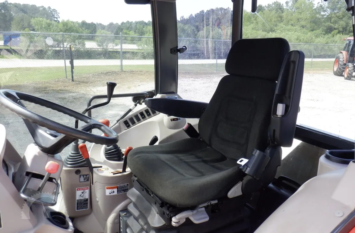 This 2013 Kubota M6040 tractor has 1,574 hours and features 4×4 drive with a hydraulic shuttle shift transmission, providing smooth and precise operation for loader work, field tasks, and property management. The enclosed cab includes heat, cold AC, and radio, ensuring operator comfort during long hours.