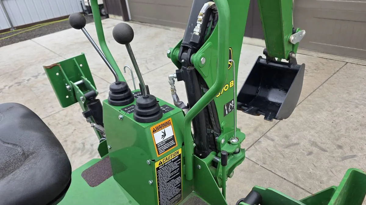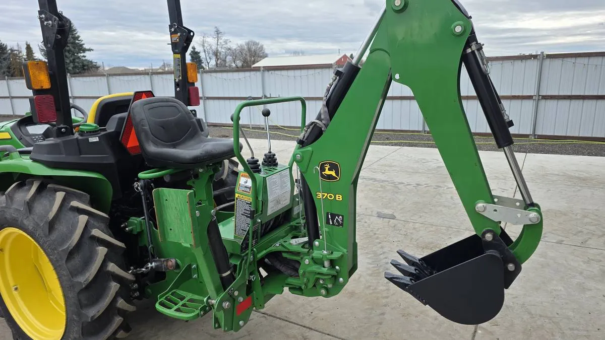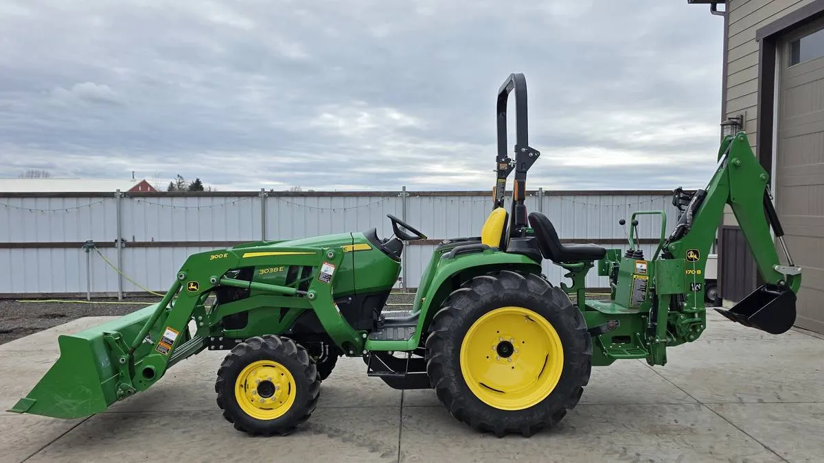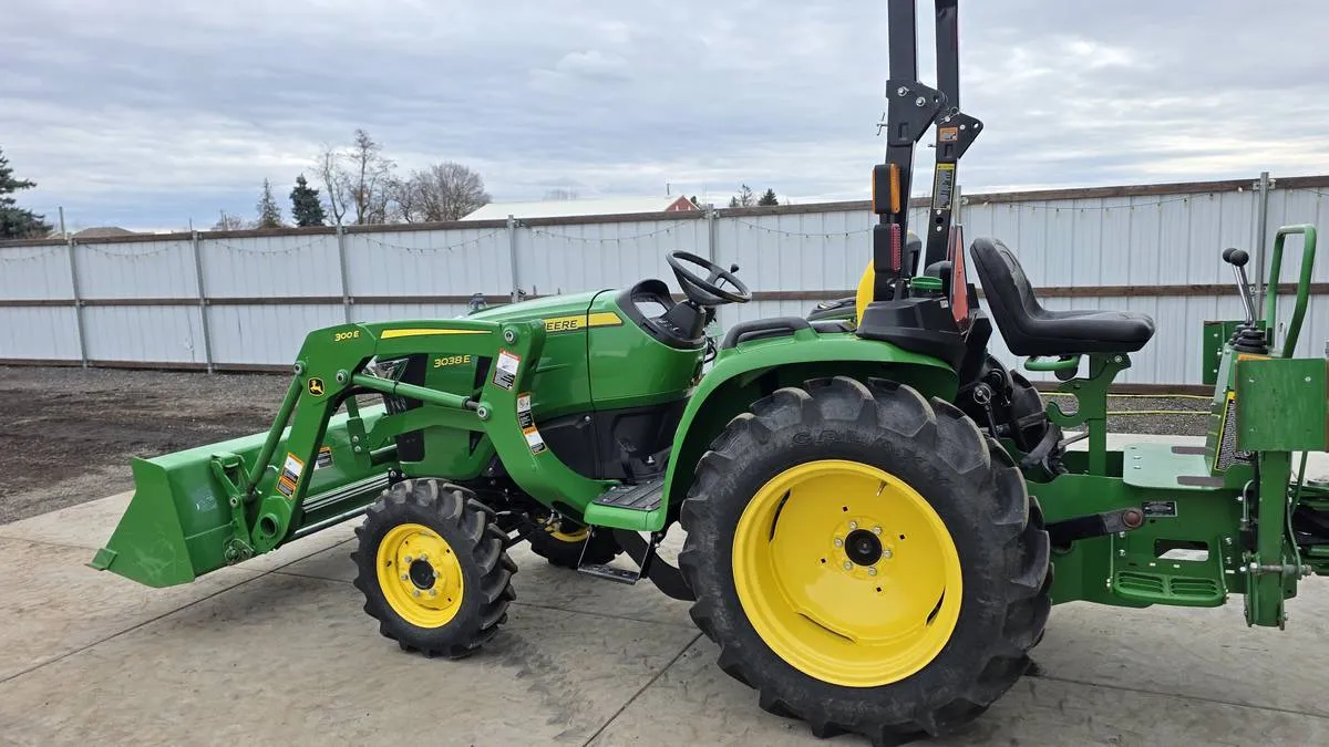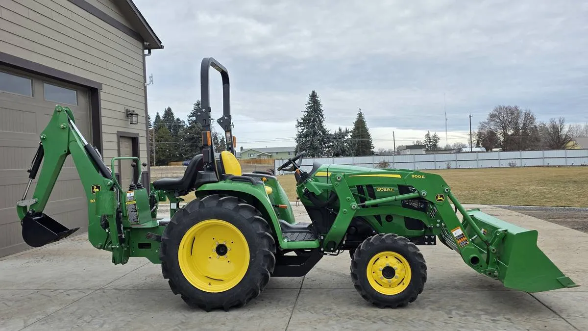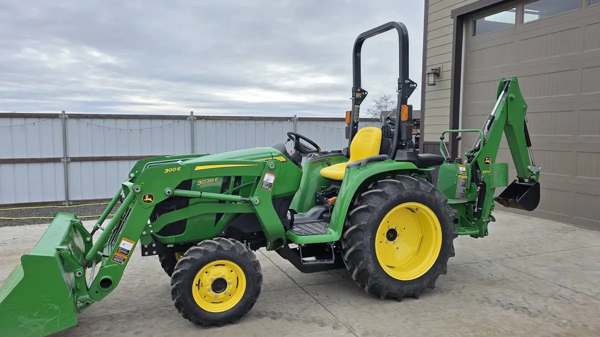 Year: 2019, Make: John Deere, Model: 3038E, Hours: 168, Drive Type: 4WD, Transmission: HST (Hydrostatic), Fuel Type: Diesel, Engine: 37 HP 3-Cylinder, Backhoe: John Deere 370B Frame-Mounted with 7 ft Digging Depth, Cab: Open Station, Serial Number: 1LV3038ELKK127384.