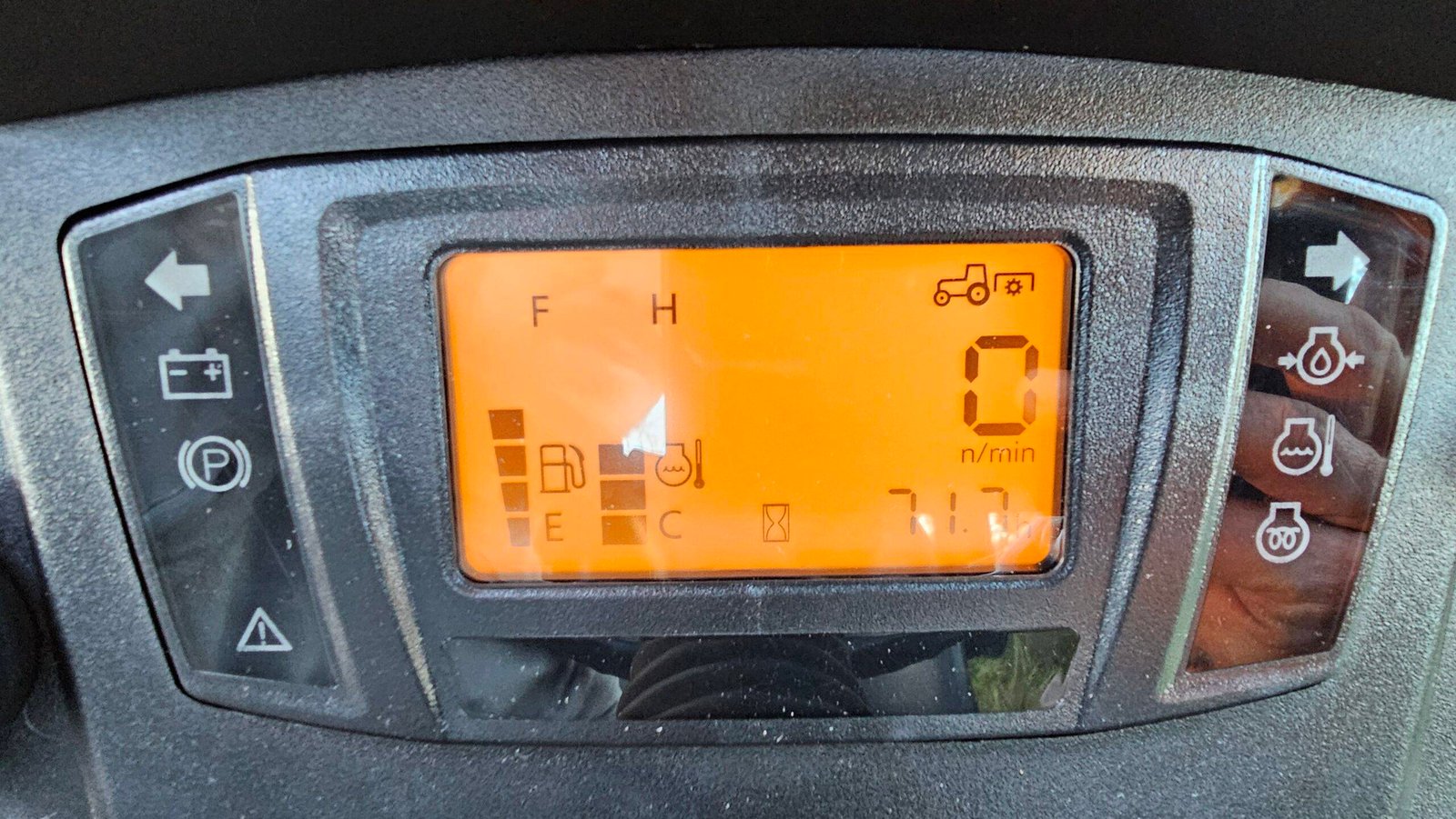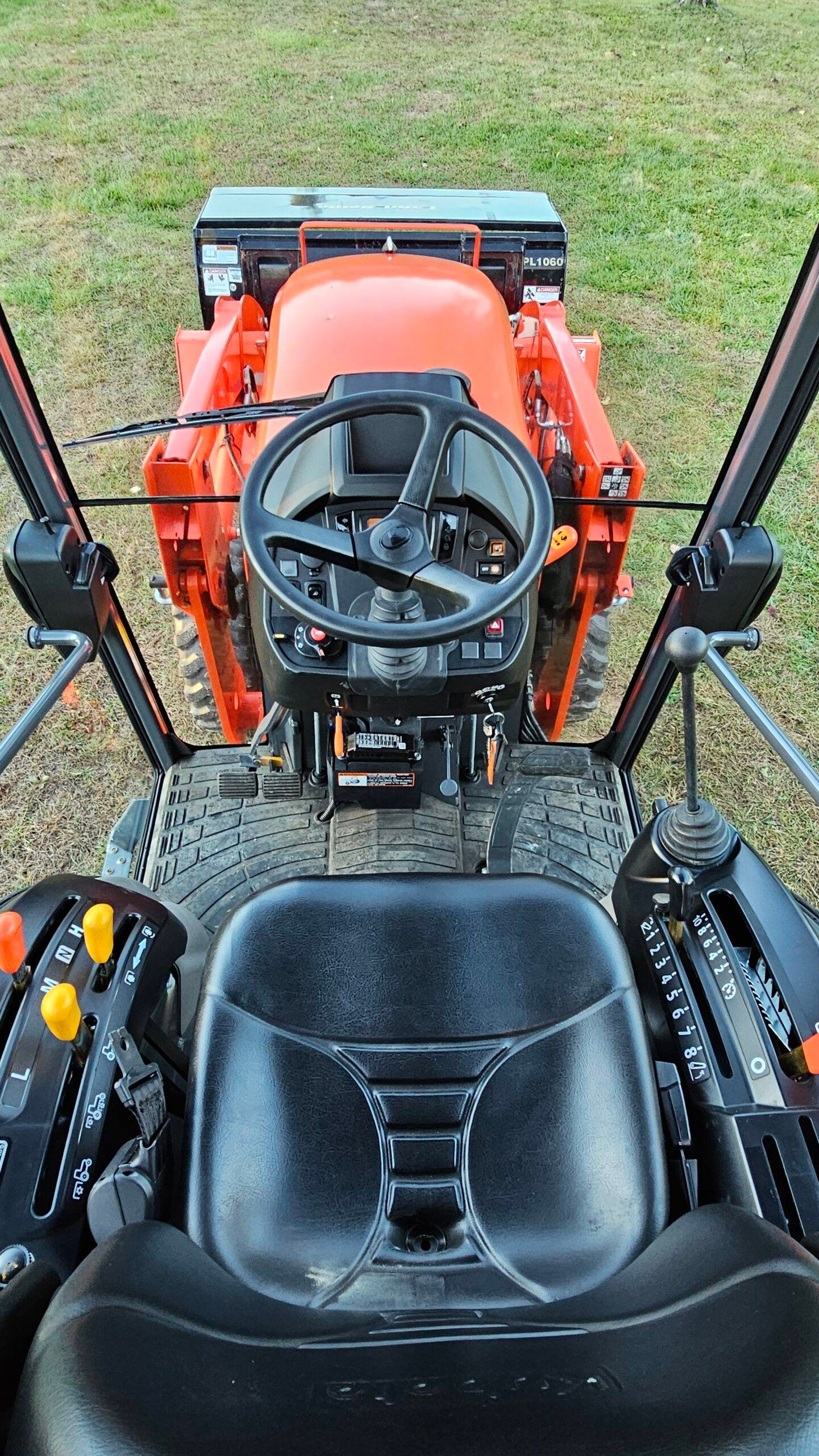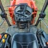 The factory enclosed cab features heat, air conditioning, radio, rear window defroster, LED work lights (front and rear), right and left mirrors, and dual side entry doors, offering excellent comfort and visibility in all seasons. Additional operator features include cruise control, tilt steering wheel, and an adjustable suspension seat with armrests.
