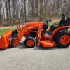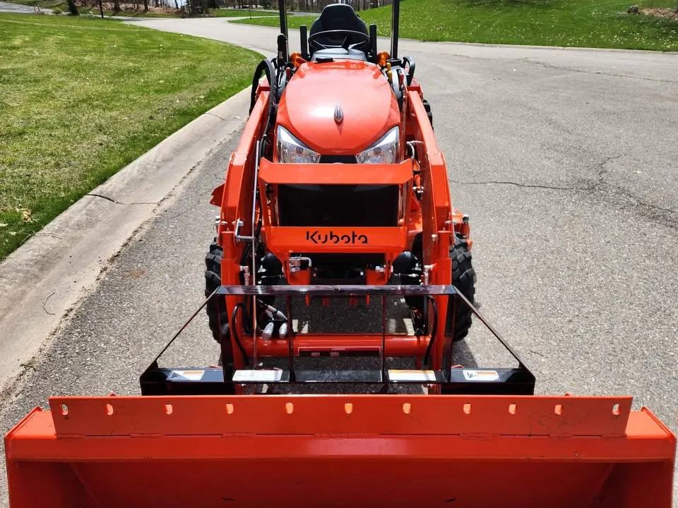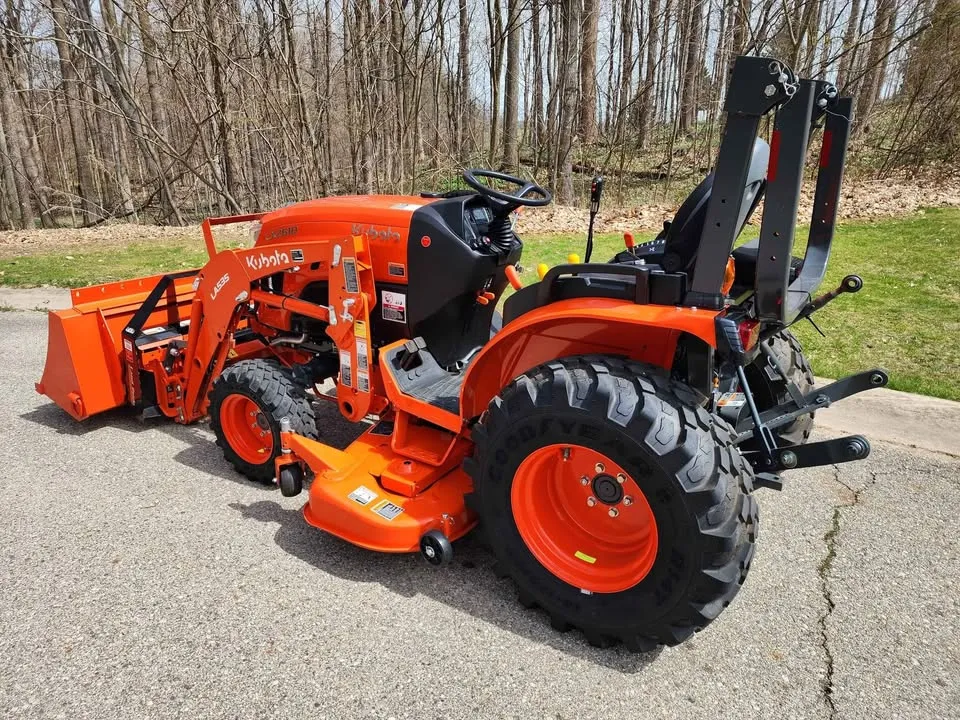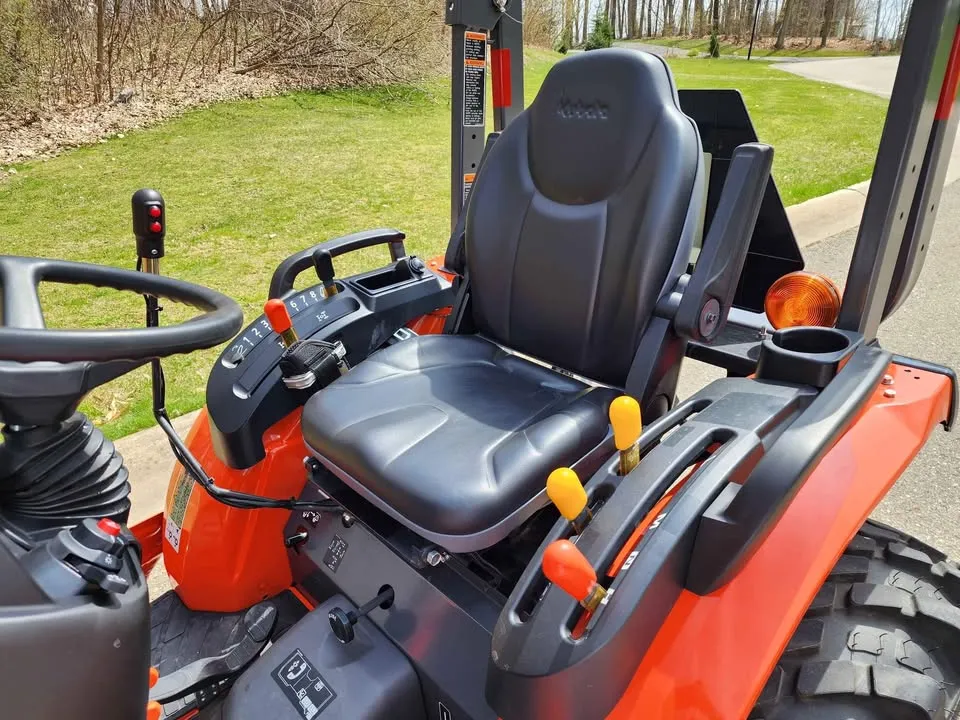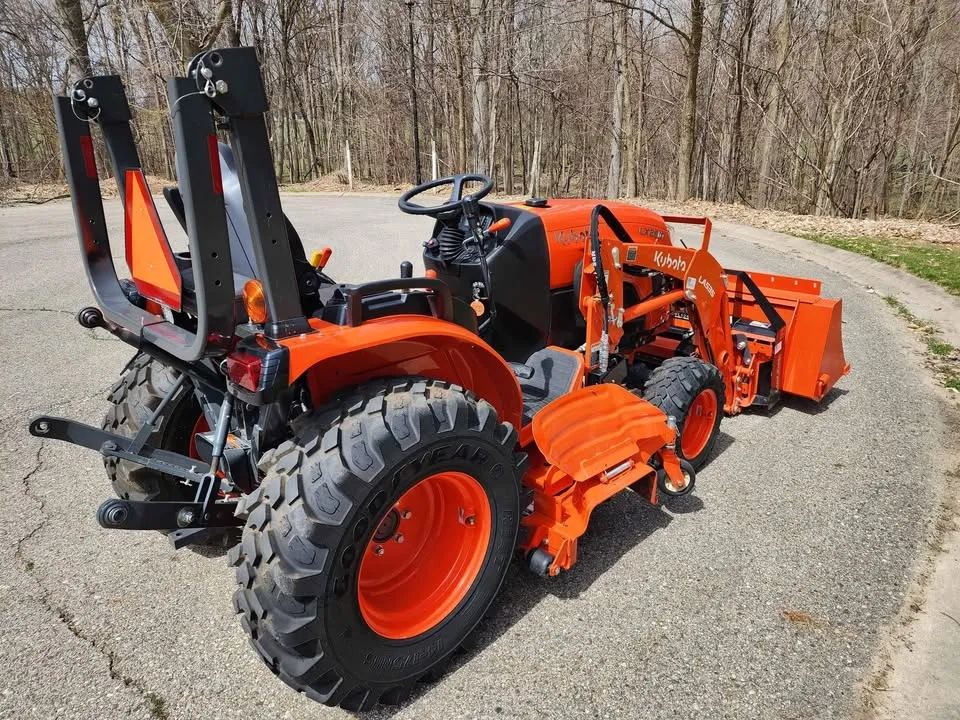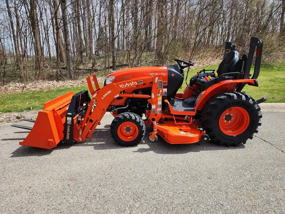 Year: 2022, Make: Kubota, Model: LX2610, Hours: 49, Drive Type: Selectable 4×4, Transmission: Three-Range Hydrostatic, Fuel Type: Diesel, Engine: 25 HP, Cab: Enclosed, Loader: LA535, Attachments: Land Pride PFL1242 Pallet Forks, 60″ Belly Mower, 60″ Skid Steer Style Quick-Attach Bucket, Mid PTO, Three-Point Hitch: Category 1, Hydraulic: Plumbed 3rd Function with Electro-Hydraulic Joystick, Tires: Goodyear R14T Hybrid, Rear LED Work Lights, Serial Number: KBUB8AHRPL1L16297.