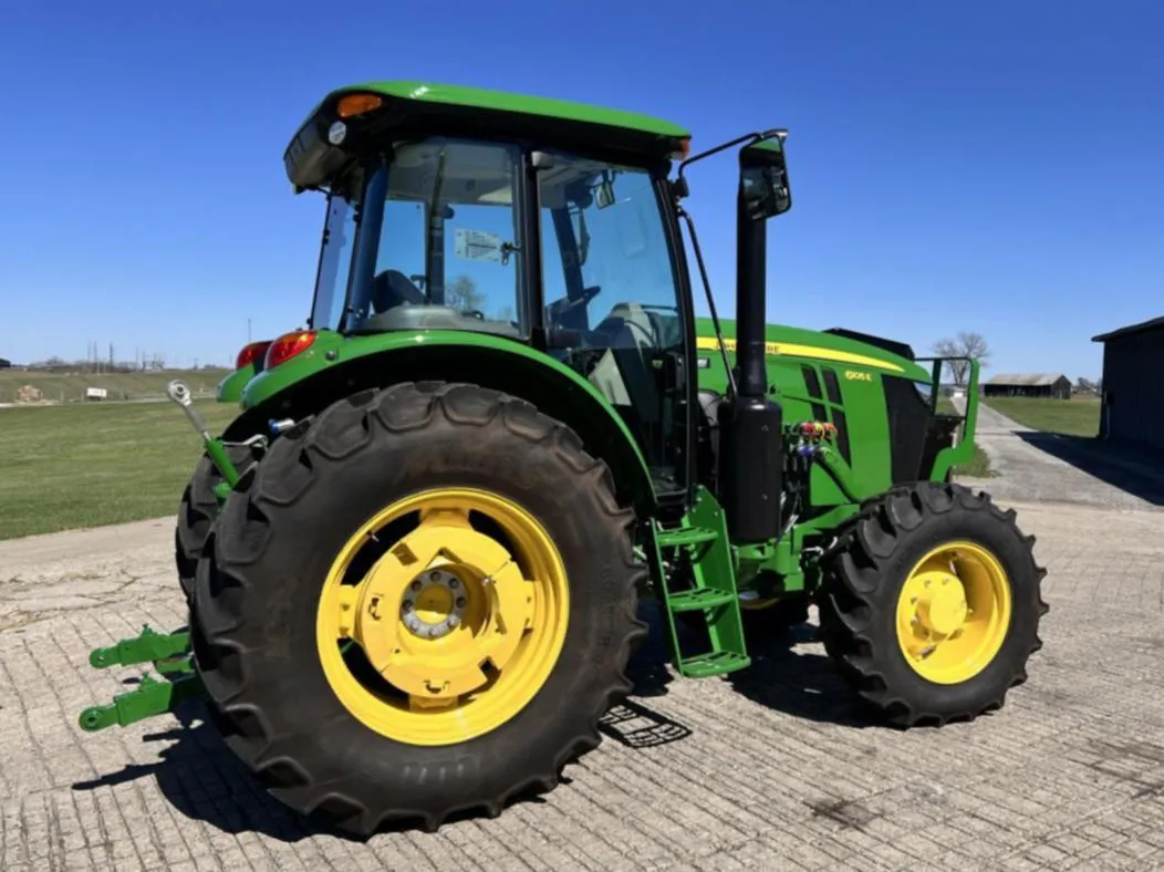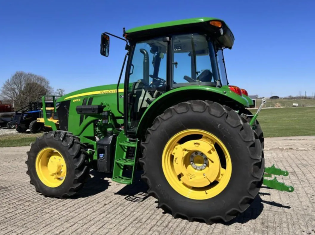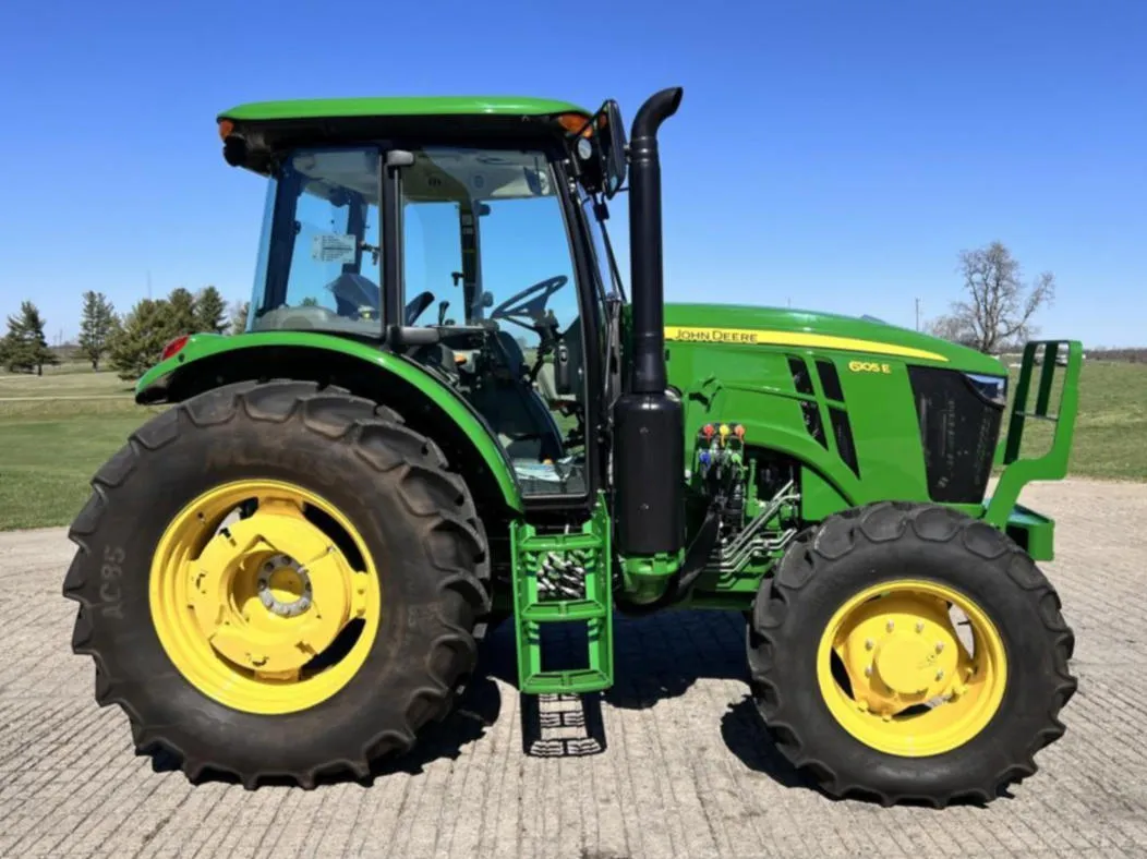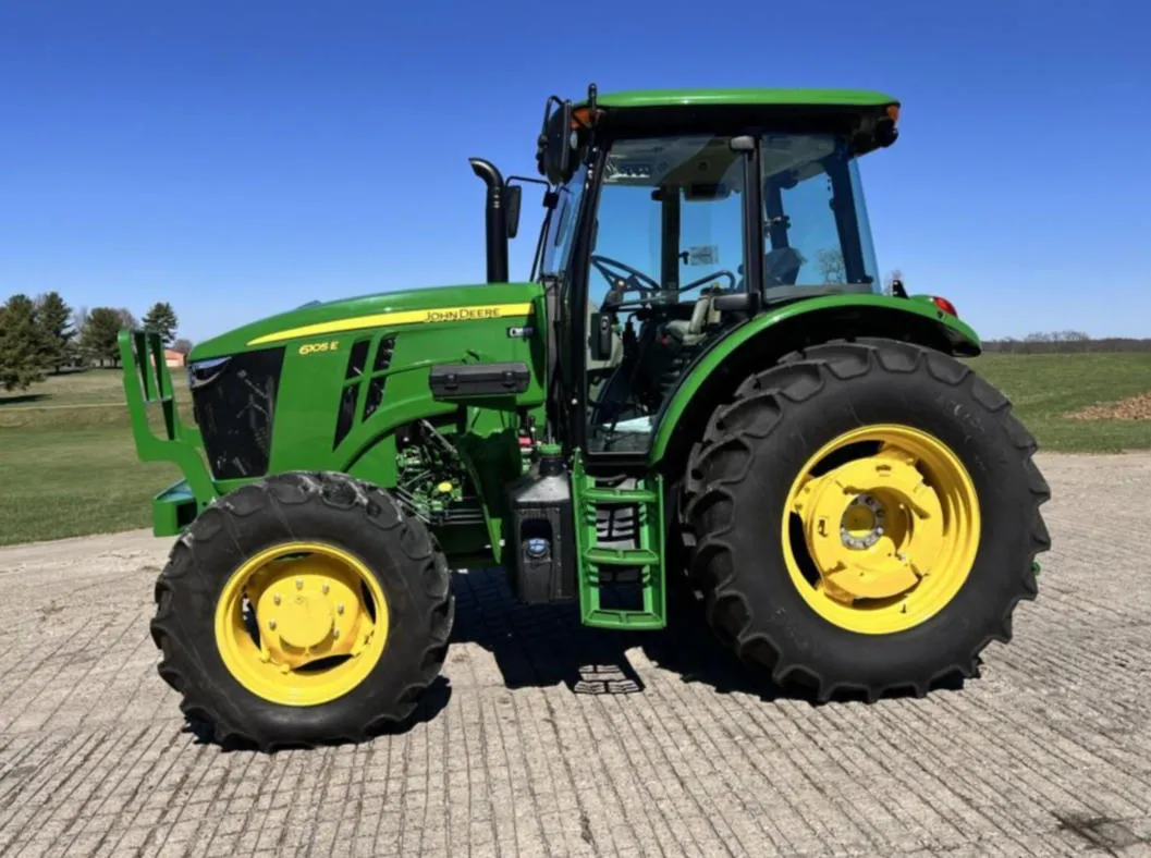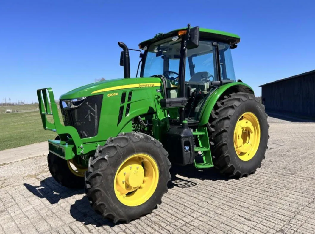 Year: 2023, Make: John Deere, Model: 6105E, Hours: 128, Drive Type: MFWD, Transmission: 12-Speed Synchro with Left-Hand Reverser, Fuel Type: Diesel, Engine Power: 105 HP, PTO: 89 HP, Cab: Enclosed with AM/FM/WB Radio, Air Seat & Buddy Seat, Loader Ready with Joystick, Tires: 340/85R24 Front, 460/85R34 Rear, Serial Number: 1P06105EJN6250804.
