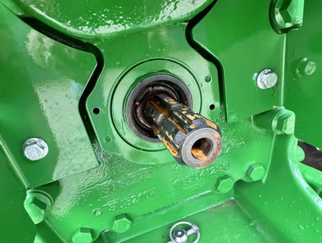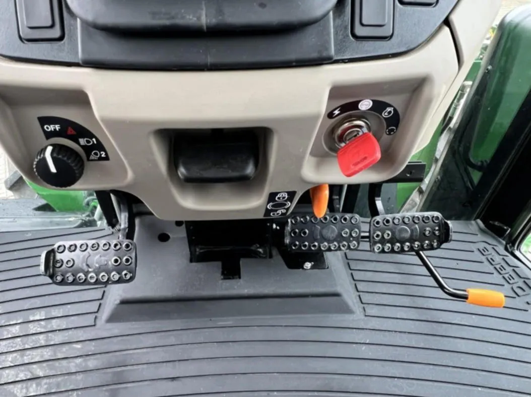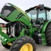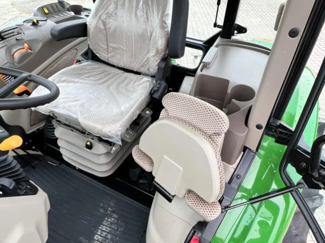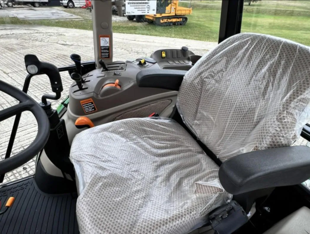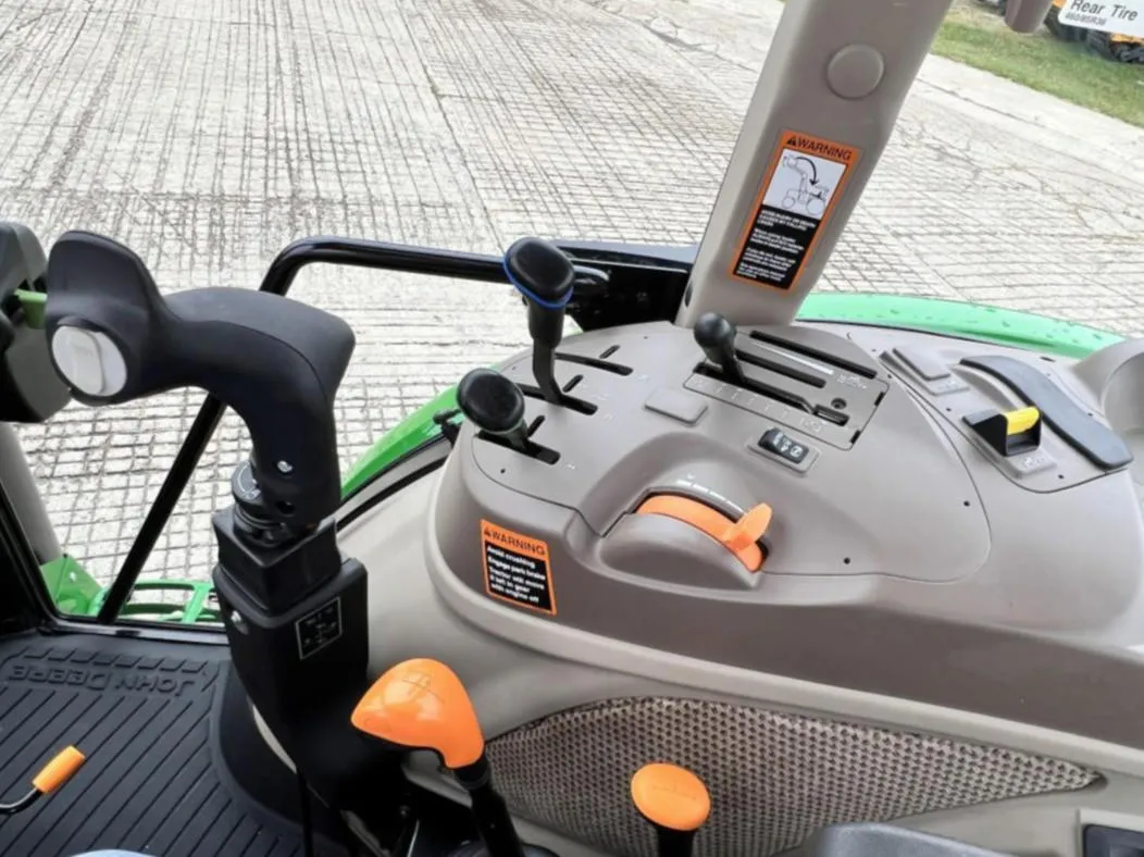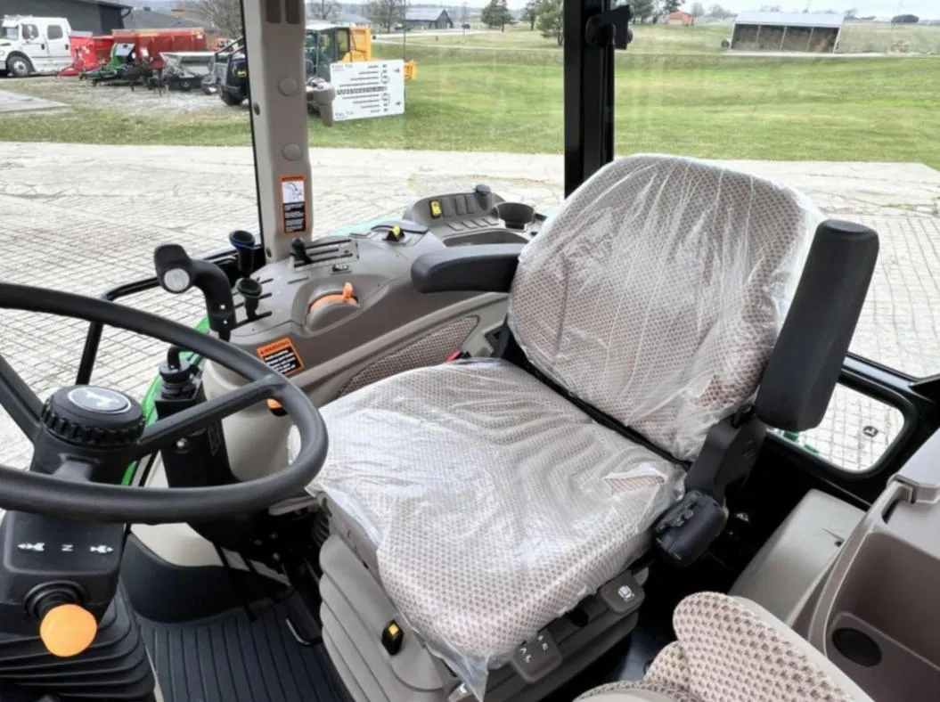 This 2023 John Deere 6105E tractor has 128 hours and comes equipped with MFWD and a 12-speed Synchro transmission with left-hand reverser, providing smooth operation and precise control for agricultural, landscaping, and material handling tasks. The enclosed cab features an air seat, buddy seat, AM/FM/WB radio, visibility roof, mirrors, and corner exhaust for operator comfort and convenience.