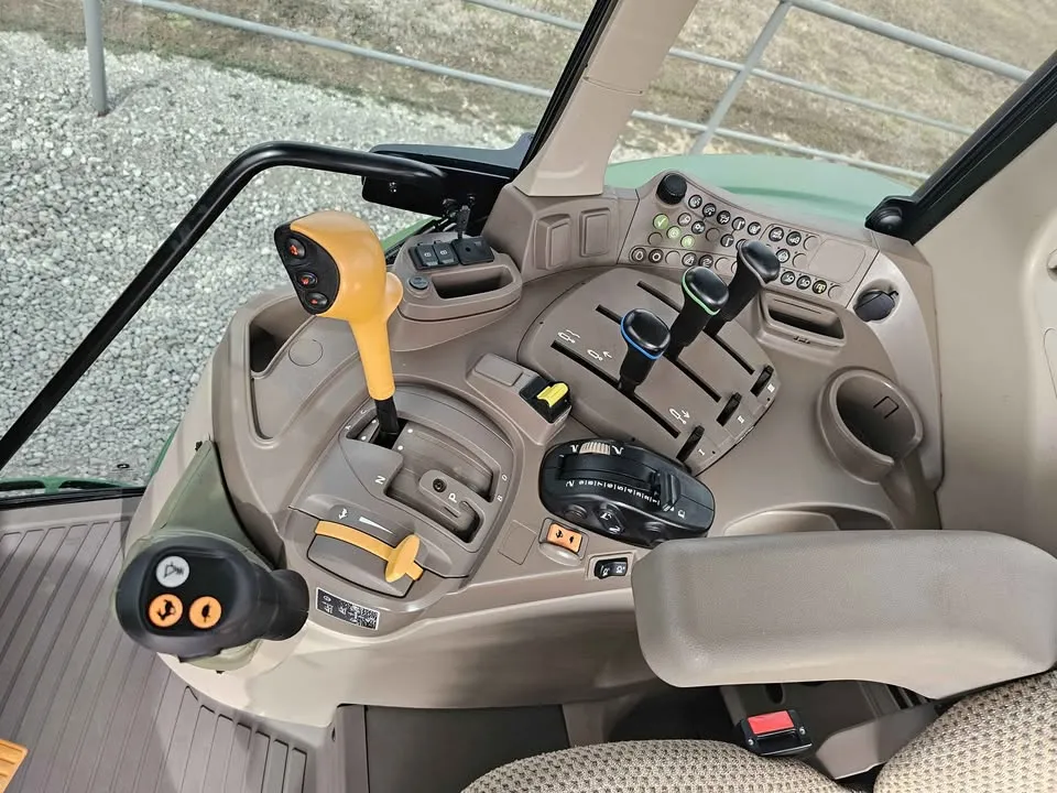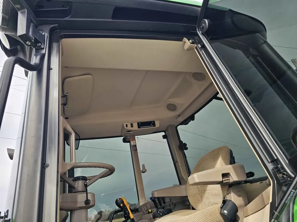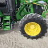 This 2023 John Deere 6120M tractor has 666 hours and features MFWD with a 16-speed Power Quad transmission and left-hand reverser, providing smooth operation and precise control for field work, loader tasks, and property management. The cab includes heat, air conditioning, radio, and a buddy seat for operator comfort during extended work hours.